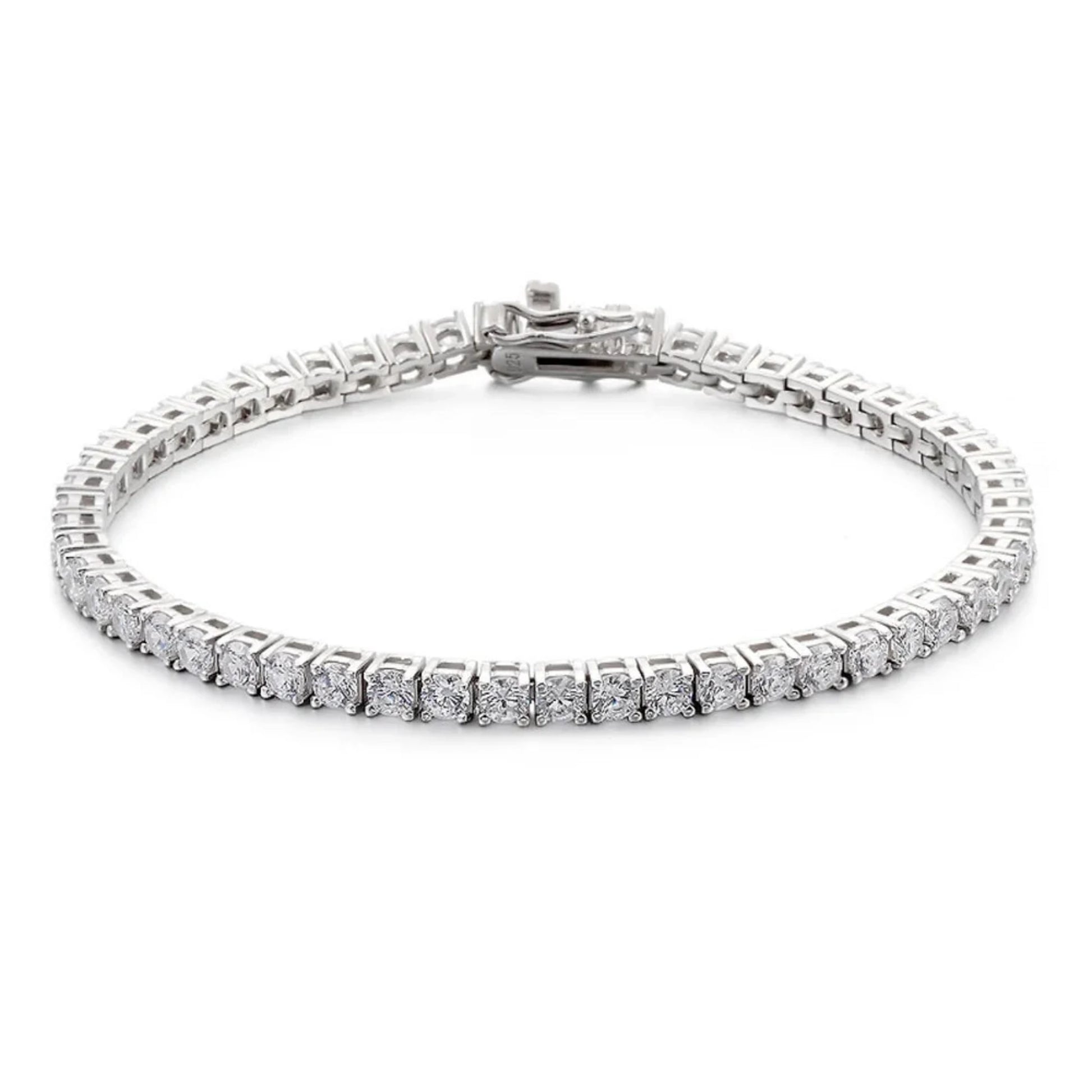 The tennis bracelet is a timeless and elegant piece of jewellery that features a row of 10 pts round-cut diamonds set in 925 sterling silver. The diamonds have a clarity rating of VVS1 in D colour ensuring exceptional quality and brilliance.