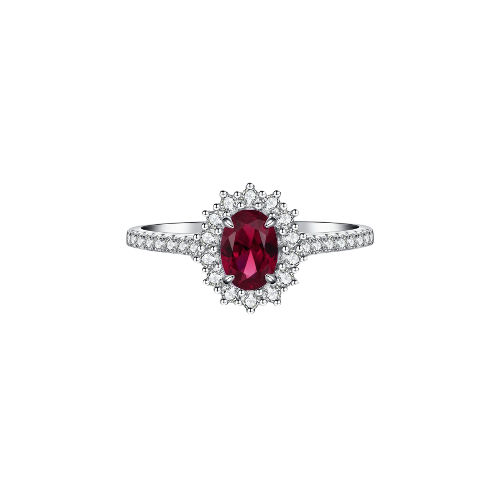 Experience the captivating charm of our 3-carat oval-cut ruby red gemstone ring. The centerpiece features a deep red gemstone surrounded by a delicate halo of diamond simulants, creating a balanced blend of color and sparkle. With its refined design, this ring adds a touch of elegance to any occasion, making it a cherished addition to your collection. Let its timeless allure adorn your fingers with understated luxury.