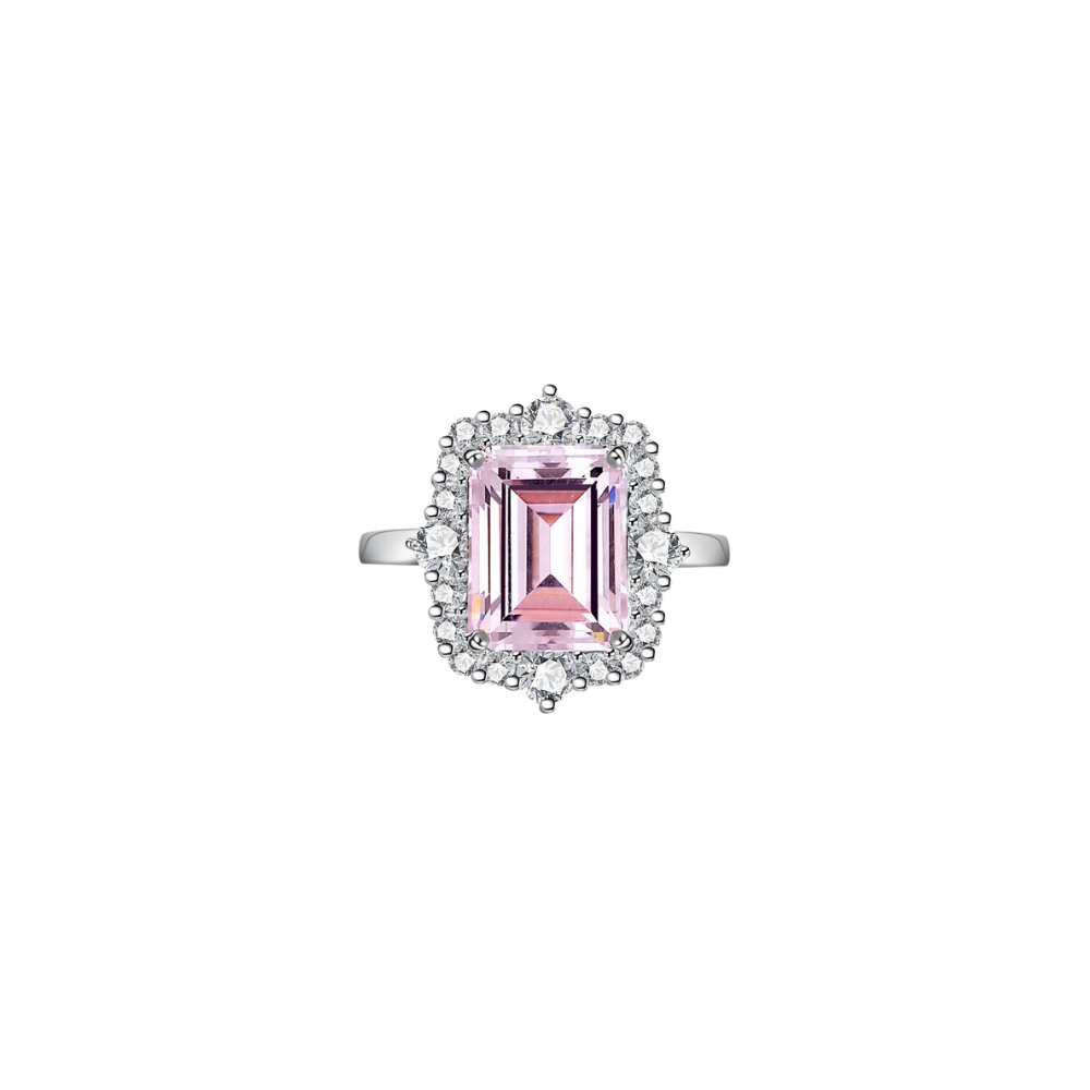 The 4-carat pink emerald-cut diamond simulant exudes a mesmerising and romantic charm, making it the focal point of this extraordinary ring. Its vibrant hue adds a touch of uniqueness that sets it apart from traditional diamond rings.